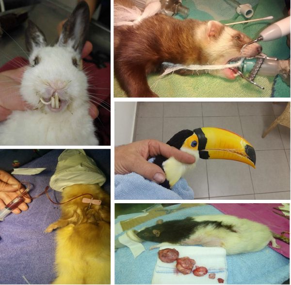מעבדה: ריסון, בדיקה פיזיקלית. לקיחת דם בחמוס, טיפול בבעיות שיניים (שימוש ביוניט דנטלית); בדיקה של חלל הפה, חיתוך חותכות, שיוף טוחנות, סירוס ארנב.